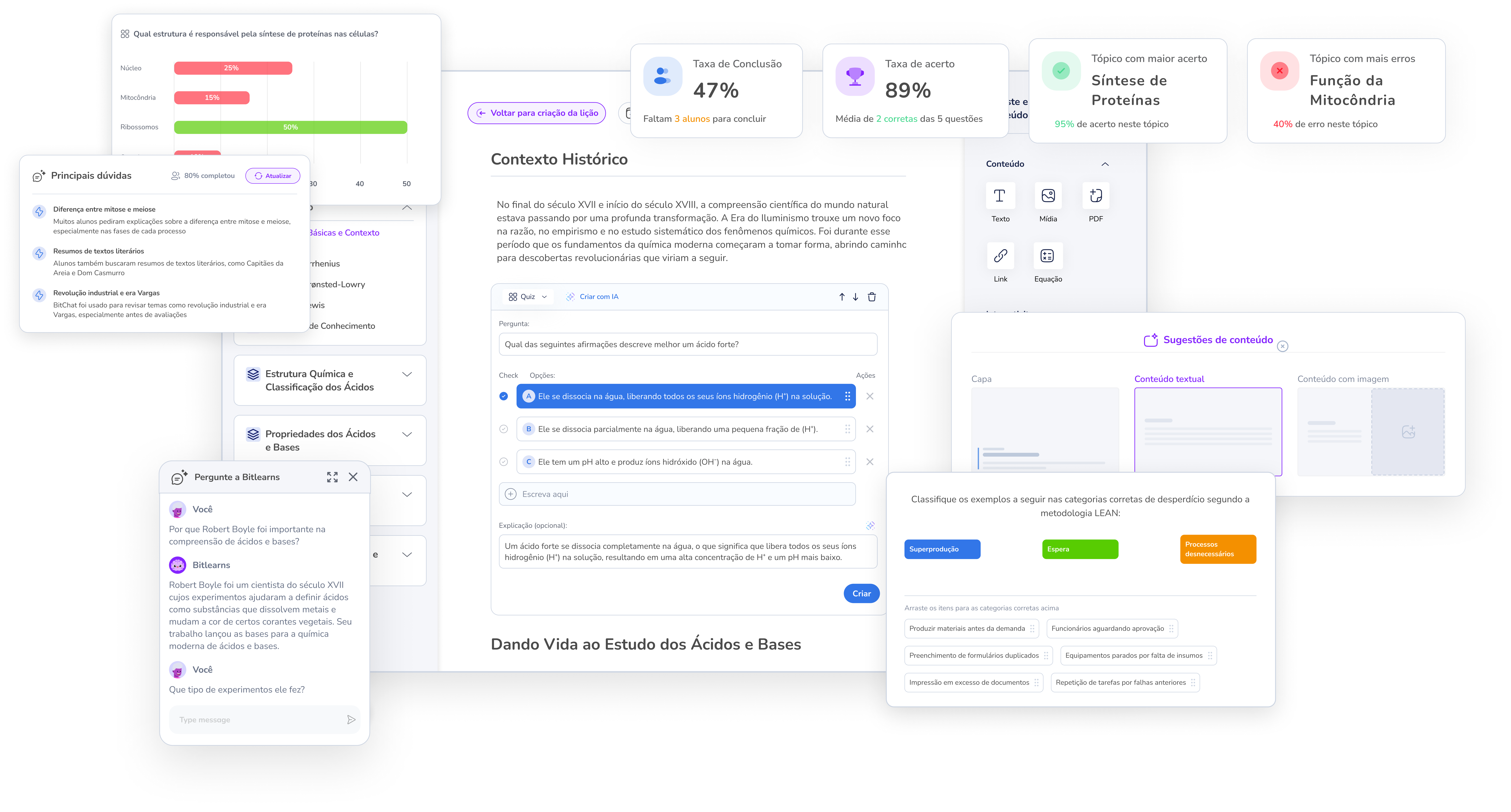 Com a Bitlearns, sua editora pode enriquecer e adaptar conteúdos existentes para diferentes contextos regionais, metodologias pedagógicas ou perfis de escola. Quando não houver material de partida, nossa IA gera rapidamente um conteúdo base a partir dos seus inputs, pronto para ajustes e evolução. Além disso, a plataforma ajuda a melhorar o texto, ajustar tom e clareza, corrigir gramática e enriquecer ainda mais seus materiais — sempre com rapidez e qualidade.